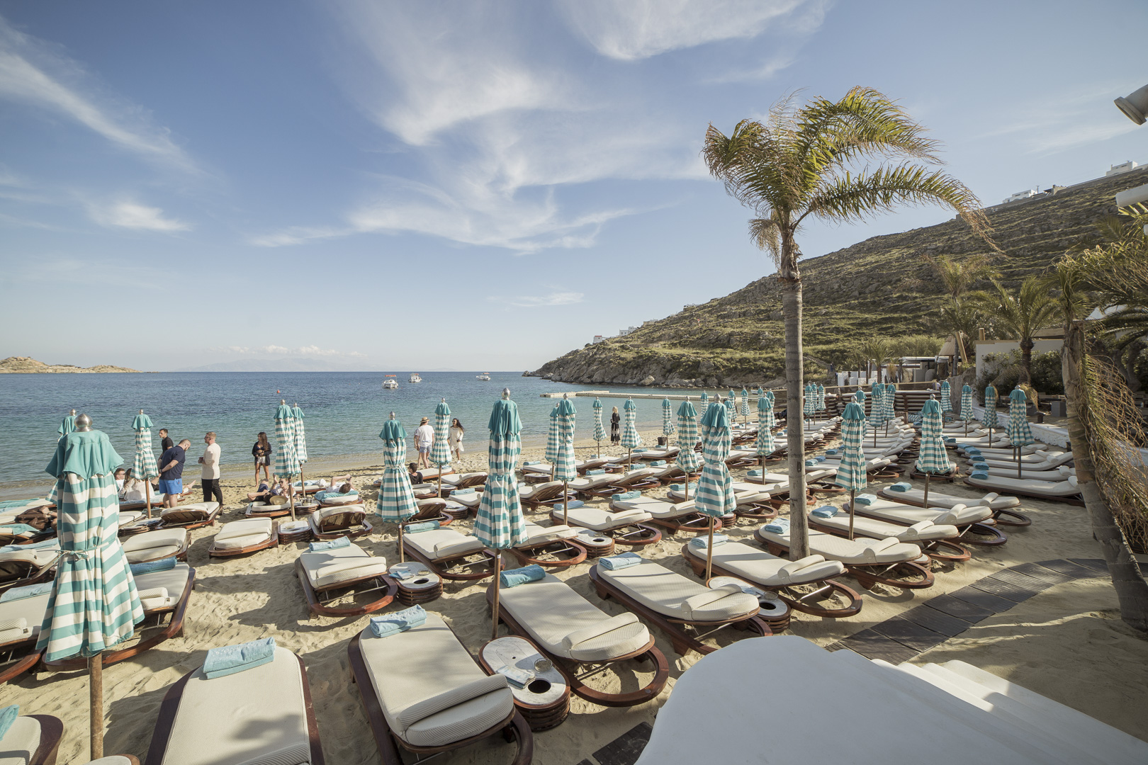 - Iconic setting on Psarou Beach with vibrant Aegean views